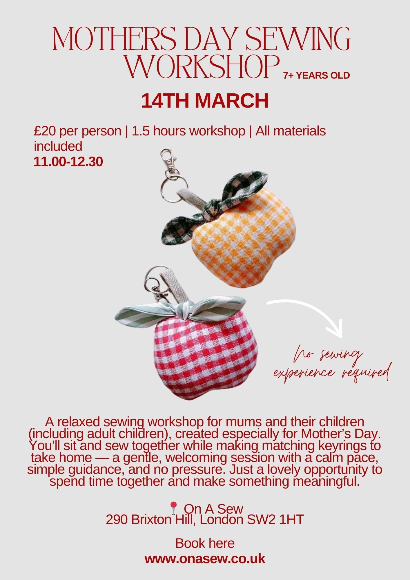 Celebrate Mother’s Day with a relaxed, creative sewing workshop for mums and their children (including adult children), suitable for anyone aged 7 and over.